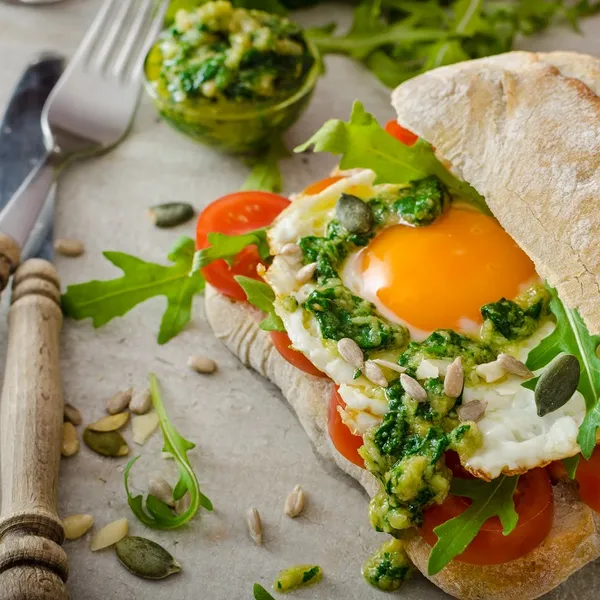 Het recept is te simpel voor woorden: in plaats van olijfolie gebruik je een lepeltje pesto om (roer)ei in te bakken.