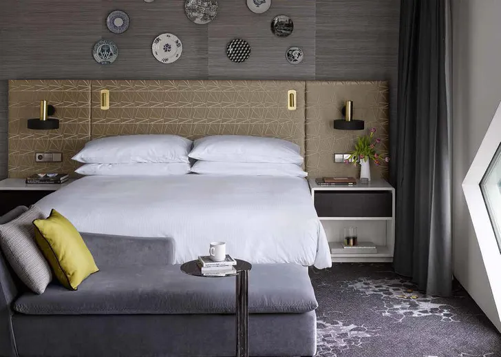 Het nieuwe hotel vormt een imposant herkenningspunt op Schiphol. Het visionaire ontwerp van Mecanoo met sterke, originele vormen valt op met zijn iconische kubusvorm ende ruitvormige gevel. Het indrukwekkende Atrium met een glazen plafond op 42 meter hoogte, vormt het dynamische hart en de belangrijkste ontmoetingsruimte van het hotel; de lobby en de lounge. Het glazen plafond en de helderwitte balustrades brengen het daglicht tot diep in het gebouw. Vanuit de galerijen hebben gasten een spectaculair uitzicht op de lobby en lounge.