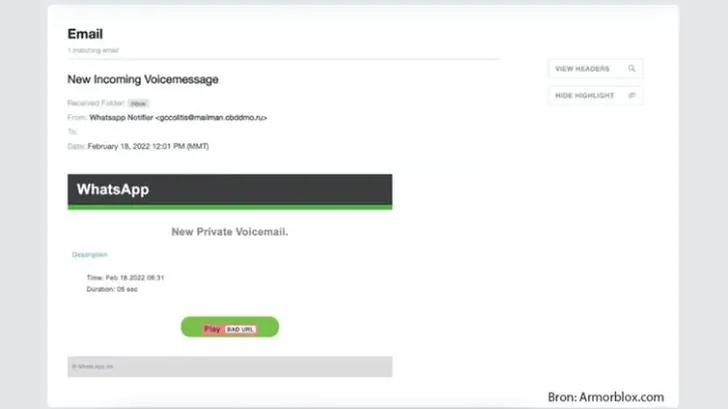 Cybercriminelen vinden steeds nieuwe manieren om mensen op te lichten. Zo moet je nu alert zijn op een e-mail waarin staat dat je een nieuwe Whatsapp-voicemail hebt ontvangen.