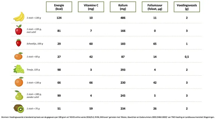 Fruit zit boordevol goede voedingsstoffen, waarvan vitamine C, kalium, foliumzuur en voedingsvezels het meest belangrijk zijn.