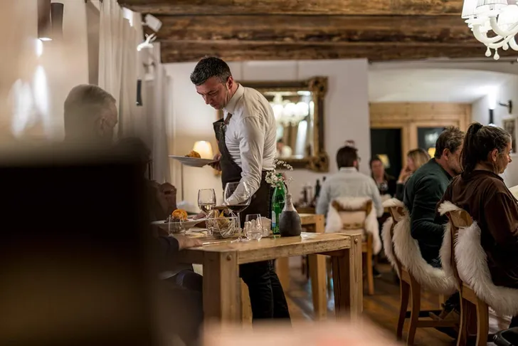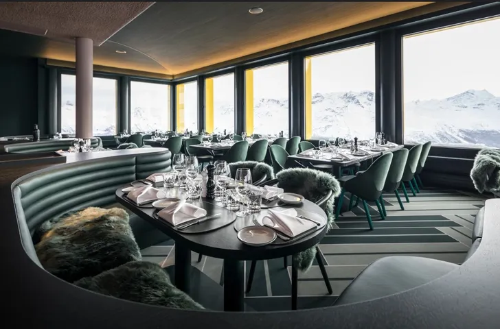 Het restaurant hoort bij Hotel Chesa Stuva Colani en doet net alsof alsof je niet midden in de Alpen zit, met een menukaart vol bubbels, kreeft...