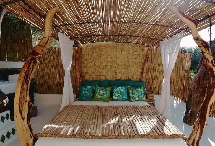 De slaapkamer biedt enige beschutting, maar je ligt echt buiten, het ruikt er naar kruiden en je wordt wakker van de geluiden van de natuur en de zonsopgang.