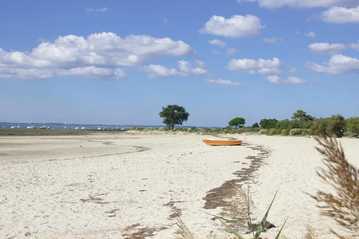 Plage d'Arcachon (ten westen van Bordeaux) is een vrij diep strand dat net als de andere drie stranden aan een enorme binnenbaai ligt. Uitzicht op het Vogeleiland en op de bootjes die af en aan varen naar Lège Cap Ferret aan de overkant.
