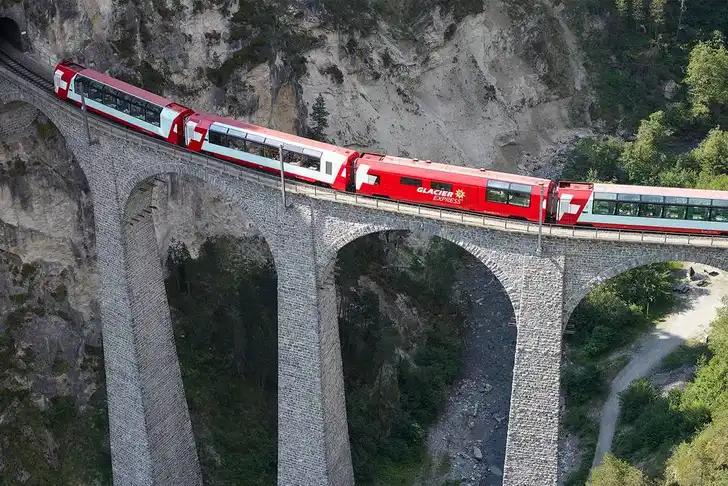 Tijdens de reis kom je over 291 bruggen, door 91 tunnels en klim je over de Oberalp-pas van 2033 meter hoog. En links en rechts is het een en al alp, sneeuw, gletsjer en rivier; delen van de route behoren tot het UNESCO Werelderfgoed.
