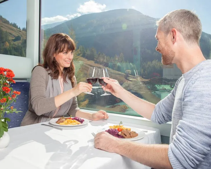 Deze trein rijdt tussen Zermatt en St Moritz en is óók als je daar niets te zoeken hebt de moeite waard. De meeste passagiers zitten acht uur lang met hun neus tegen de panorama-ramen...