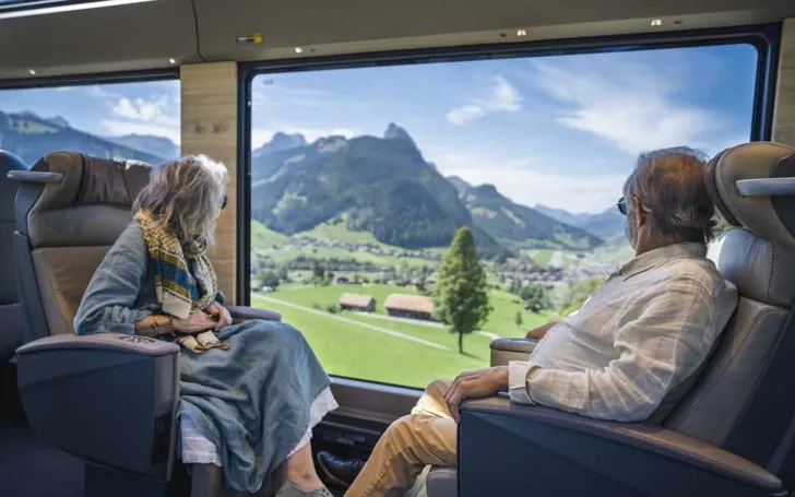 De Goldenpass Express heet-ie, de nieuwe toeristentrein extraordinaire die sinds afgelopen weekend door de Zwitserse Alpen rijdt en in drie uur en een kwartier hotspots als Montreux, Gstaad en Interlaken zonder overstappen met elkaar verbindt.