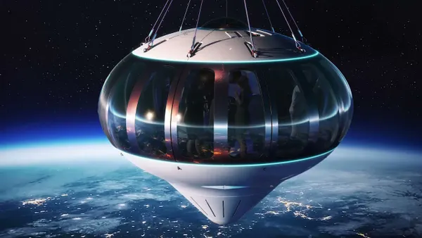 De Space Lounge is een soort luchtballon 2.0 en een vlucht duurt zes uur. Je komt er niet meer buiten de dampkring (geen gewichtloosheid, dus) maar hij gaat wel hoog genoeg om de kromming van de aarde te zien en de eerder genoemde duisternis.