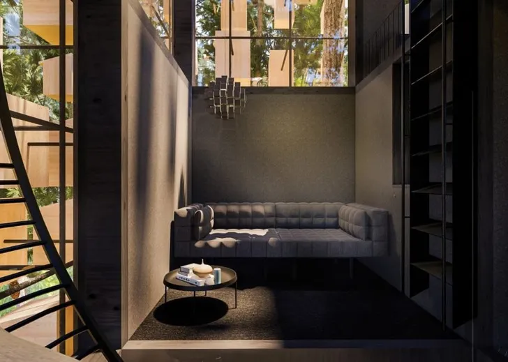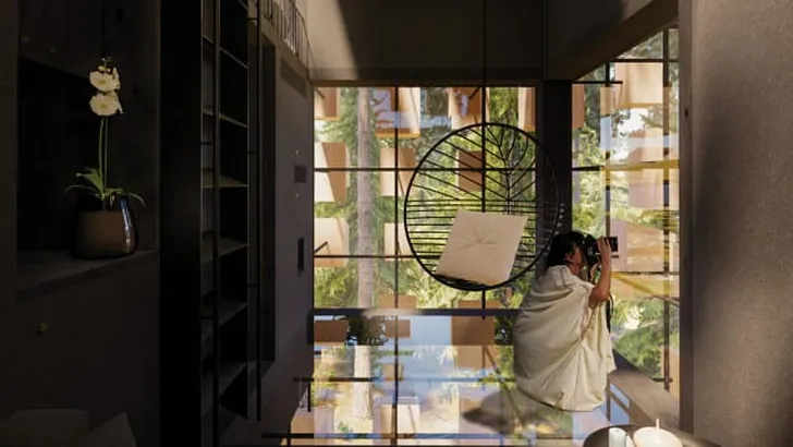 De Biosphere heeft een dakterras dat 360 graden uitzicht biedt over het bos – het zal de droom van elke vogelaar zijn. Driedubbel glas moet binnen voorkomen dat je geen oog dicht doet als een eksterfamilie een fittie heeft.