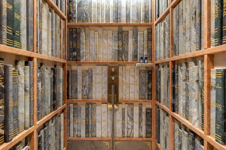 De vijftien kamers zijn versierd met 1200 met de hand gesneden en met bladgoud ingelegde boekruggen van marmer...