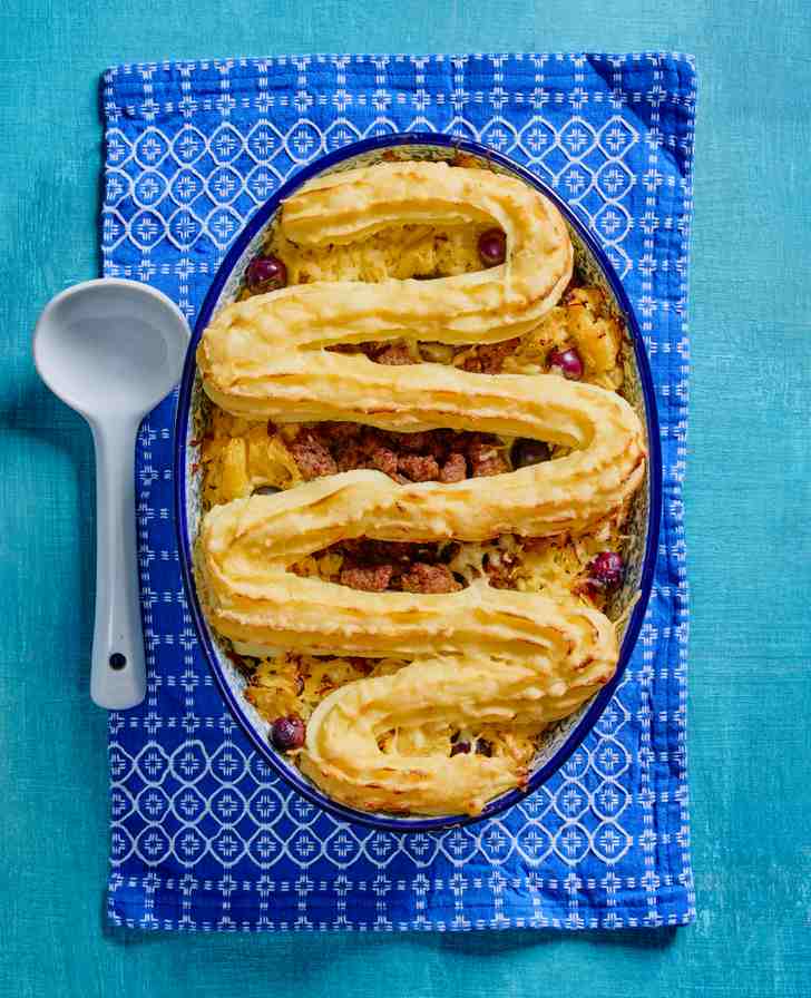 Schil de ananas en snij het vruchtvlees in stukjes. Doe de ananas met de zuurkool in een pan, giet de room erbij en breng aan de kook. Laat met het deksel op de pan op laag vuur 25 minuten sudderen. Bak het rundergehakt in een klontje boter rul en bak het kerriepoeder even mee. Breng op smaak met een beetje zout en peper. Schil de aardappels en kook ze in 20 minuten gaar. Giet de aardappels af en stamp ze tot puree. Verwarm de melk en roer deze door de gestampte aardappels. Breng de puree op smaak met een beetje zout en peper. Verwarm de oven voor tot 180°C. Meng de blauwe bessen door de zuurkool en schep dit in een ingevette ovenvaste schaal. Verdeel het gehakt in het midden over de zuurkool. Spuit met een spuitzak met kartelmondje de aardappelpuree over de zuurkool. Je kunt de aardappelpuree eventueel ook gewoon helemaal over de bovenkant uitsmeren, dat is iets minder decoratief maar wel lekker praktisch. Bestrooi de bovenkant met geraspte jonge kaas en zet de schotel 20 minuten in de oven.