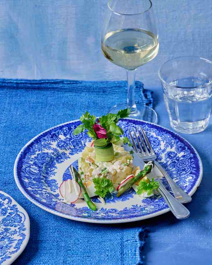 ‘Een klassieke, maar tijdloze allemansvriend. In mijn modernere variant gebruik ik gerookte kipfilet omdat je deze niet meer hoeft te koken, maar vooral ook omdat de rooksmaak heel lekker is in dit feestelijke voorgerecht.’
