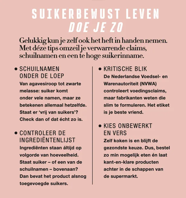 De meeste consumenten struinen de supermarkt af, lezen claims als ‘zonder geraffineerde suikers’, ‘toegevoegde vezels’ of ‘rijk aan eiwitten’ en leggen het product vol vertrouwen in hun mandje. Maar voedingsproducenten zijn niet zo transparant als ze lijken. Gewoon ‘suiker’ op het etiket zetten? Daar doen ze niet aan. In plaats daarvan gebruiken producenten meer dan vijftig schuilnamen, zoals dadelsiroop, agavesiroop of kokosbloemnectar. Klinkt chic, maar het is ook gewoon suiker. Daardoor krijg je als ‘bewuste consument’ vaak onbedoeld alsnog toegevoegde suikers binnen. Bijvoorbeeld via ‘gezond’ vruchtensap, kant-en-klare pastasaus of een bakje yoghurt.
