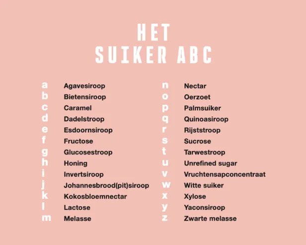 Hoe het kan dat er zo veel producten met valse claims in de schappen liggen? Het is te wijten aan het gebrek aan duidelijke regelgeving en handhaving. Het Diabetes Fonds ontwikkelde het Suiker ABC: een lijst met alle schuilnamen van suiker overzichtelijk op een rij (zie kader op deze pagina’s). Let op: een schuilnaam op een etiket betekent niet dat het product direct verboden terrein is. Het gaat vooral om bewustwording en balans. Zo smaakt die appeltaart of kaasstengel nóg beter.
