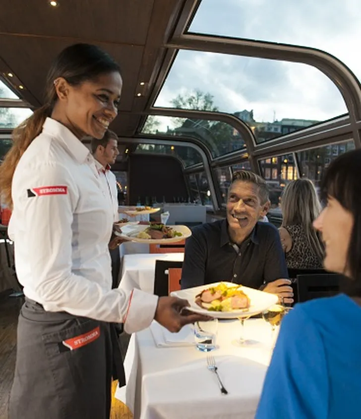Je wordt ontvangen op een luxe rondvaartboot vlakbij Amsterdam Centraal. Terwijl je langzaam over de prachtige grachten van Amsterdam koerst, geniet je van een uitgebreid 4-gangendiner.