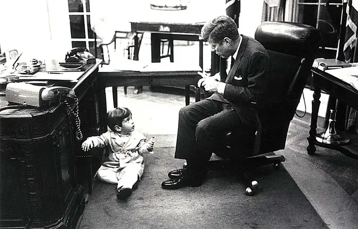 ...maar met Jacqueline aan zijn zijde gaf hij de politiek jeugdig elan en glamour: hier kust JFK zijn dochter Caroline welterusten, voor Jackie en hij naar een bal gaan. Het sprookje van Camelot, zoals de Kennedy-tijd werd genoemd, eindigde toen de president in 1963 in Dallas werd vermoord door Lee Harvey Oswald. De samenzweringstheorieën over het 'waarom' duren tot de dag van vandaag.
