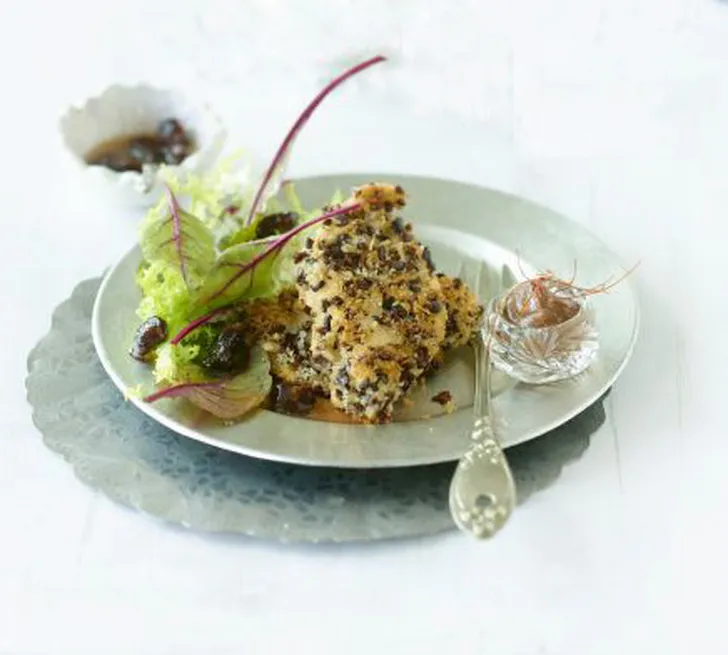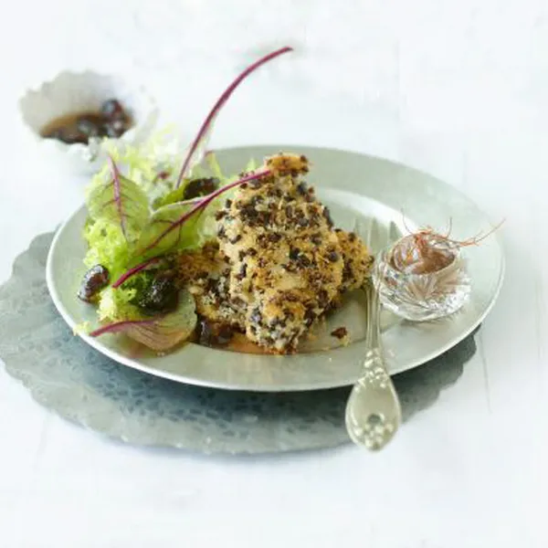 Dep de kipfilets droog en bestrooi ze met zout en peper. Hak de noten en de cacaobonen fijn en meng ze in een diep bord met het paneermeel. Strooi de bloem in een diep bord. Klop in een derde diep bord de eieren los. Wentel de kipfilets door de bloem, dan door het ei en druk ze vervolgens rondom in het paneermeelmengsel.