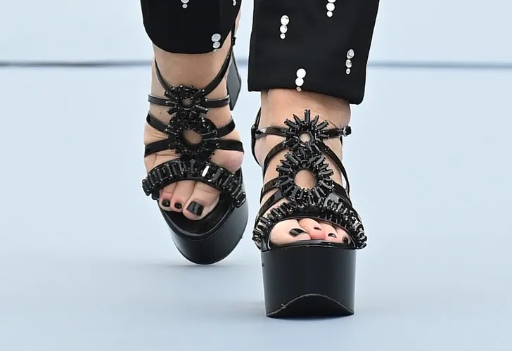 De regen deerde haar niet ("Ik ben Brits en wel wat gewend"), de schoenen wel: "Ik zal over de catwalk lopen als een klossende reuzin. Maar ze zijn wel fantastisch, want je bent er meteen een stuk langer meer, zeker in gezelschap van al deze gazelles."