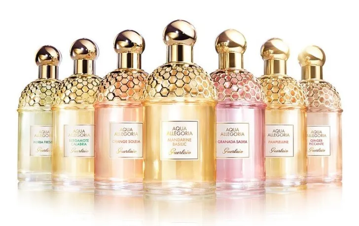 Nummer vier is een redactiefavorietje: de Aqua Allegoria-flesjes van Guerlain, met het kenmerkende honingraatmotief.