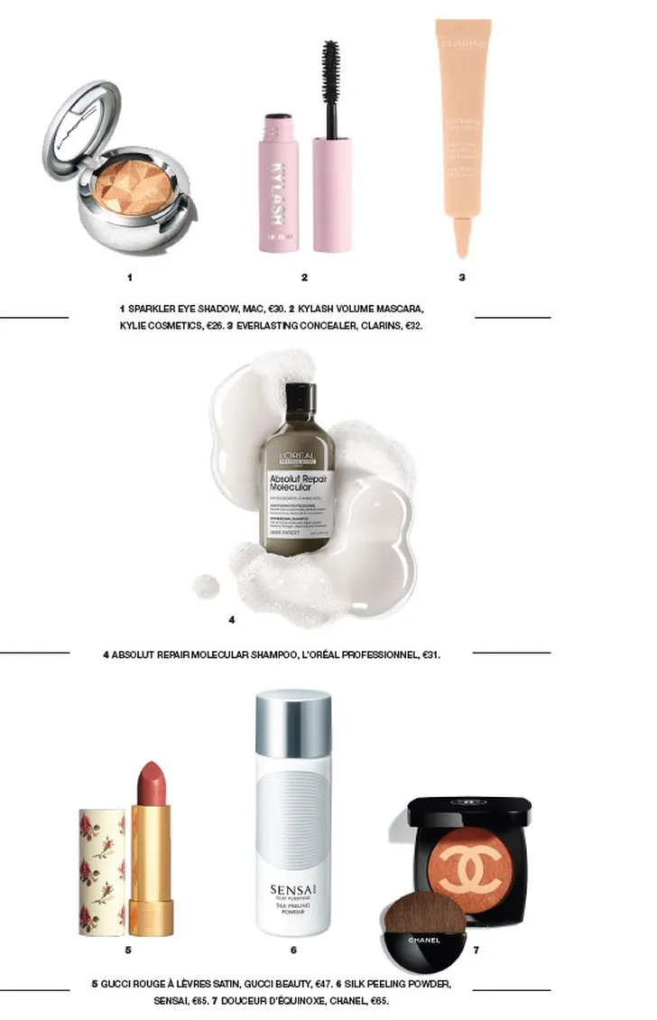 Ik geloof zelf heilig in het gebruik van een powderpeeling. Die van Sensai is geweldig. Het is een heel milde scrub waarmee je de opperhuid ietsje dunner maakt. Daarmee krijg je meteen die glow. Veel mensen denken dat die in je foundation of allerlei glimproducten zit. Nee, die zit in de basis. Na de peeling een serum, daarna eventueel dagverzorging en áltijd een spf.’