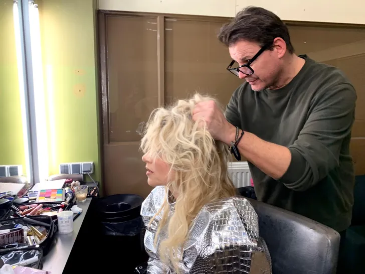 ‘Ik ben lang bezig geweest met Ellens haar, met als doel het eruit te laten zien alsof ze zo uit bed komt. Ik heb het eerst goed doorgeborsteld, daarna – onderaan beginnen – pluk voor pluk bewerkt met de stijltang. Daarvoor heb ik eerst een goede bescherming aangebracht. Dat is nodig bij gekleurd haar als dat van Ellen, dat ook een tikje poreus is. Ik gebruik graag de Extreme Play Safe up to 200c Heat Protection van Redken.