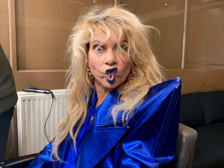 ‘Voor één foto ben ik lekker all the way gegaan met blauwe metallic lippen (met oogschaduw van MAC en lipgloss van Dior). Ellen kan het allemaal heel goed hebben, het is leuk om mee te performen, maar niet echt om mee naar de supermarkt te gaan. Bij de flashy ogen heb ik de lippen juist heel licht gehouden. Ik heb ze omrand met een potloodje van Chanel Le Crayon Lèvres in nude en ingevuld met de Bare Matte Liquid Lipstick van Kylie Jenner. Een beetje gloss van Dior Addict en klaar. ’