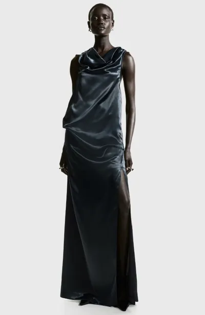 Het moment is daar: de eerste drop van de partycollectie van H&M is gelanceerd en we spotten meteen een pareltje. Deze lange satijnen halterjurk in marineblauw is een echte eye-catcher. Met een halternecklijn, lange strik in de nek en een subtiele drapering in de taille oogt 'ie elegant en feestelijk. De rechte onderkant met een verleidelijke split maakt 'm extra geschikt voor de feestmaanden, want die gala’s en diners zitten er toch echt alweer aan te komen.