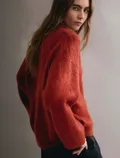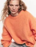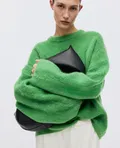 Omdat de trui een flink volume heeft, werkt hij het best met een contrast in silhouet. Draag de oversized mohair-mix bijvoorbeeld met een strakke leren broek of een mooie kokerrok van satijn. Het contrast tussen de zachte wol en een glad materiaal maakt je outfit direct interessant.
