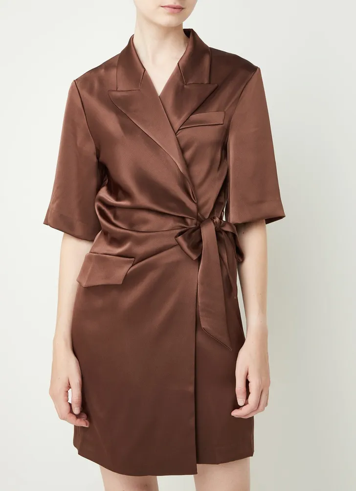 Amar wikkeljurk in blazerstijl van satijn met strikceintuur van Nanushka (Bijenkorf € 540)