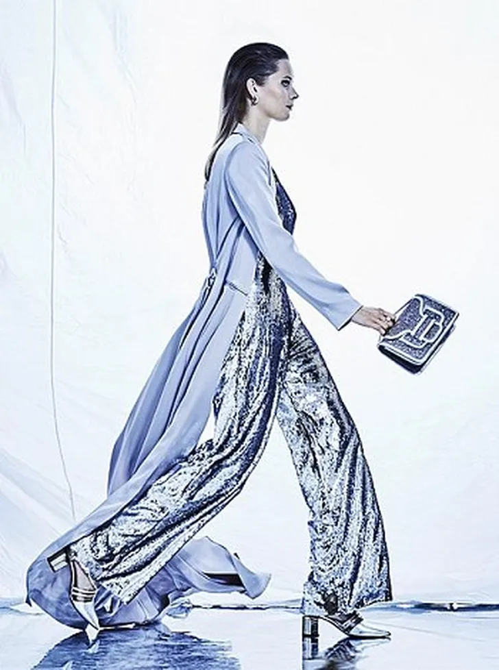 Jas (€ 650) en jumpsuit (€ 1.490) van Paule Ka. Sandalen (€ 650) en glittertas (€ 590) van Pierre Hardy.