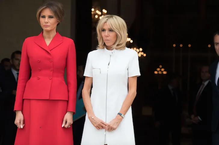 Tijdens een bezoek aan de Trumps koos de Franse first lady voor een prachtige vloerlange japon in ivoorkleur. De mooiste wat ons betreft.