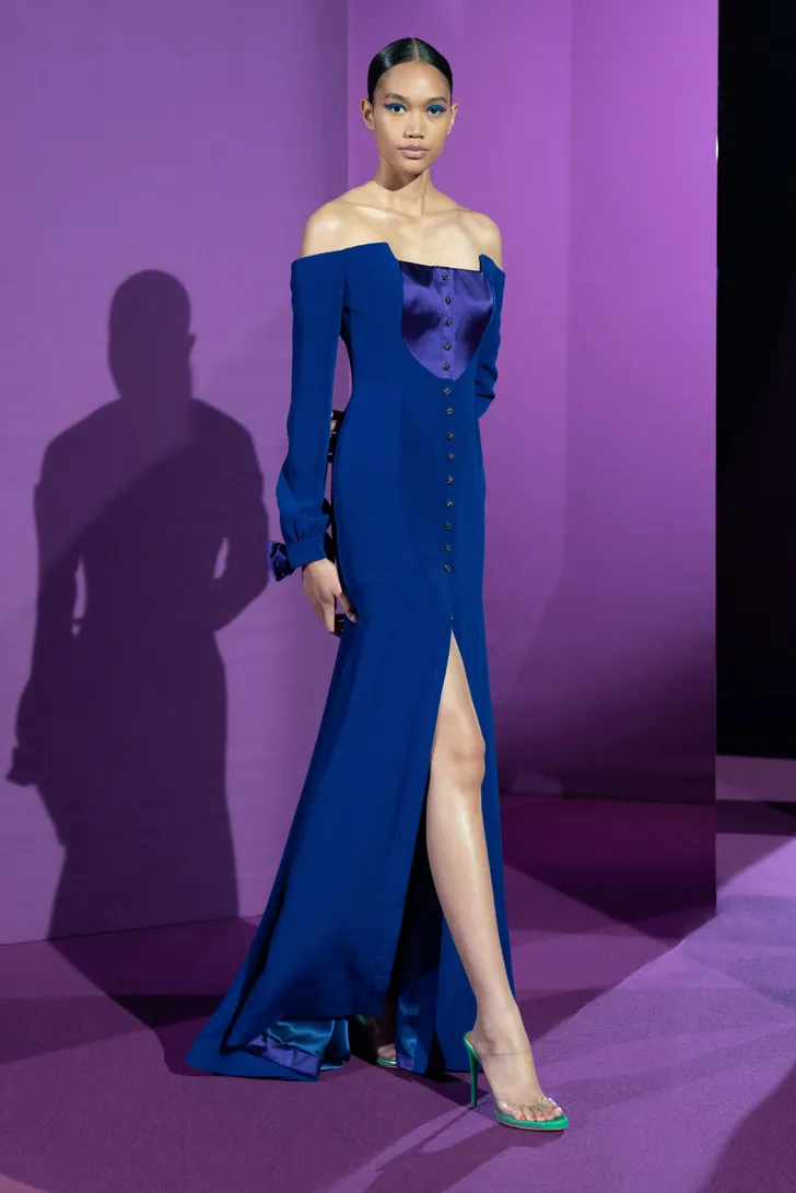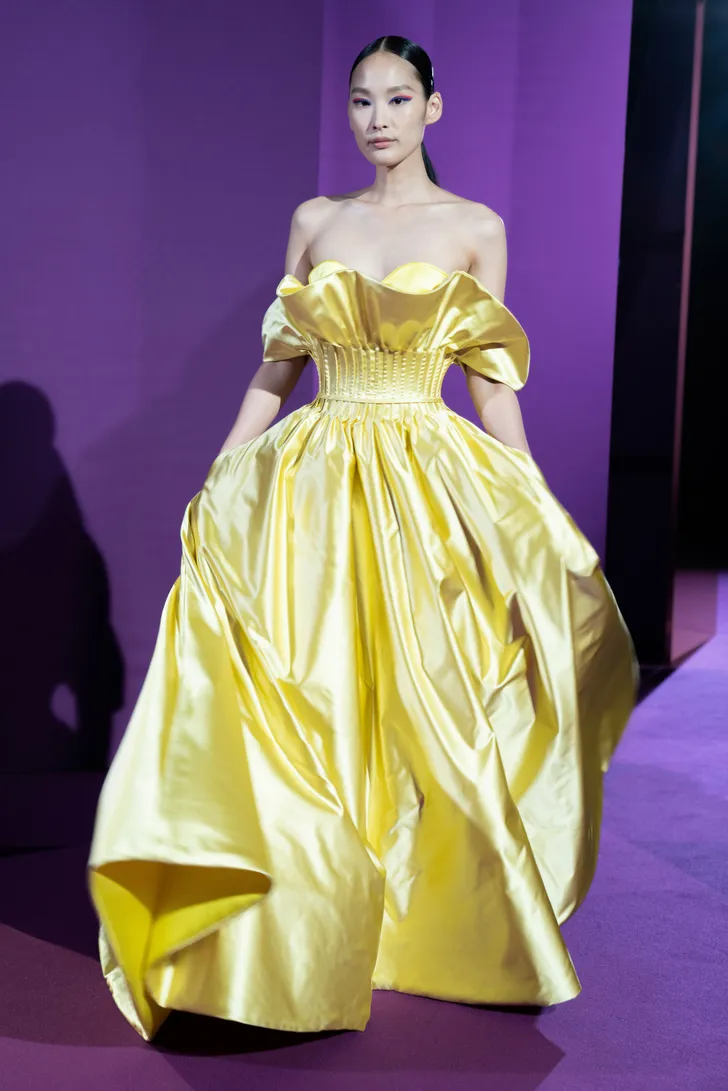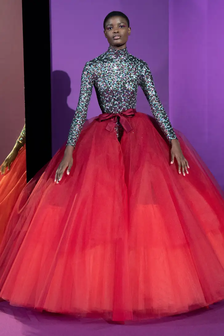 In vergelijking met de vrij donkere A/W 2021-2022 collecties van collega's, is de haute couture van Alexis Mabille alsof je een bijouterie-doos vol edelstenen opent: veel kleur, veel glamour en ook hier: veel volume.