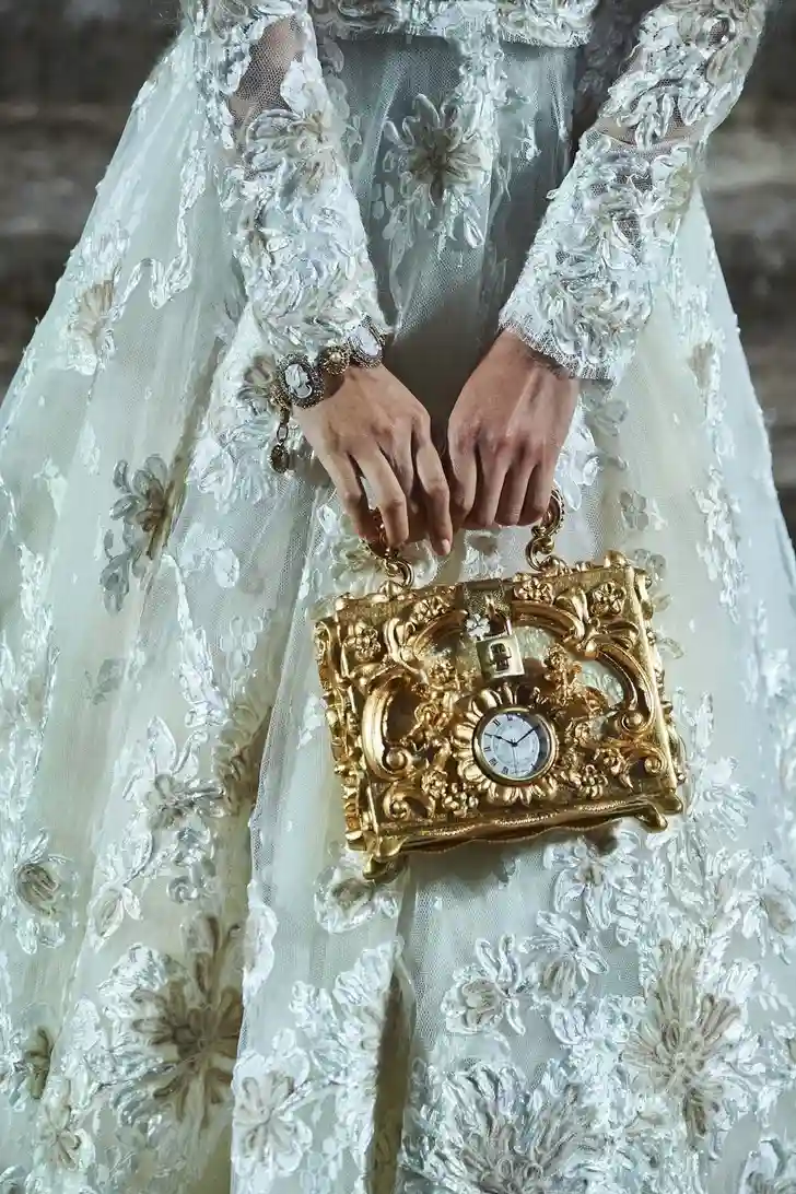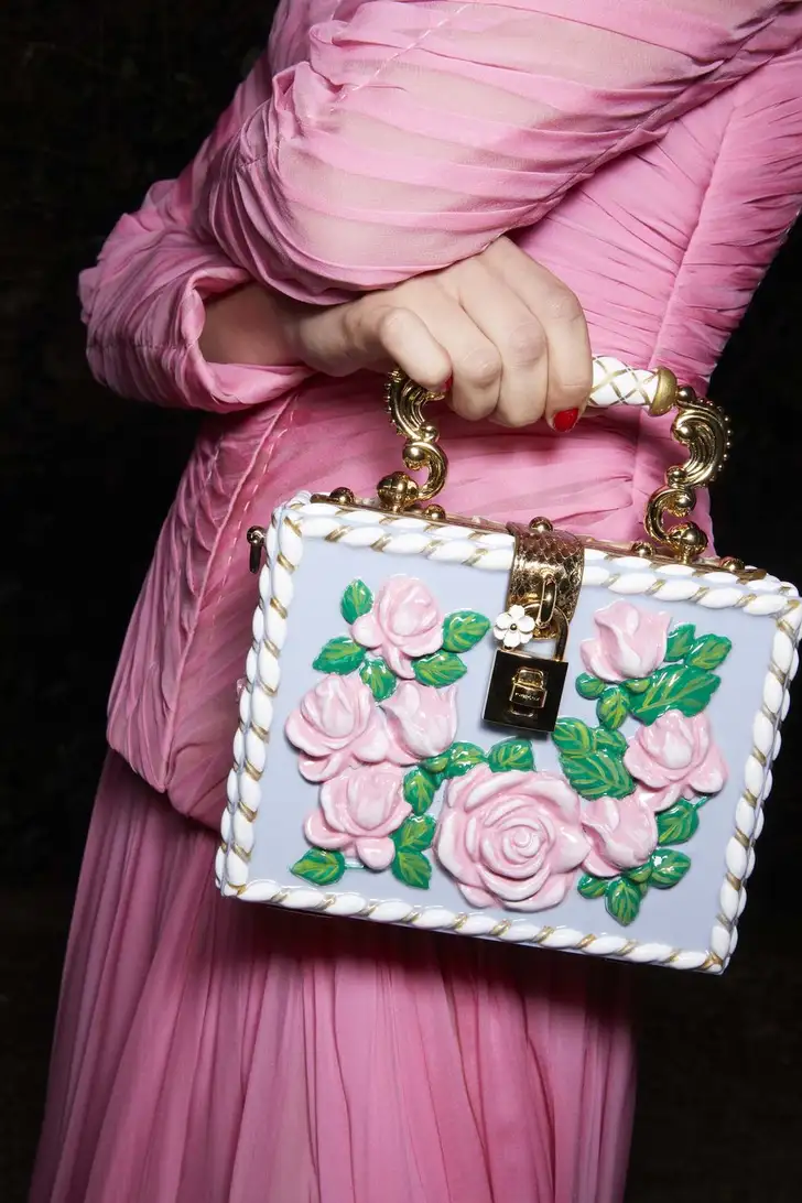 D&G vertaalde dat in alles behalve armetierige looks met borduurwerk, flonkerende stenen, 3D bloemen en tule, adembenemend veel tule, en dit geweldige handtasje. Geniet even mee!