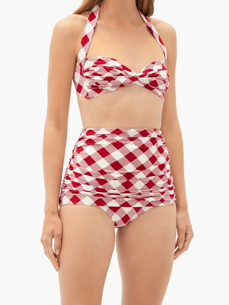 Retro bikini van Norma Kamali in rode gingham (Matches Fashion € 170)
