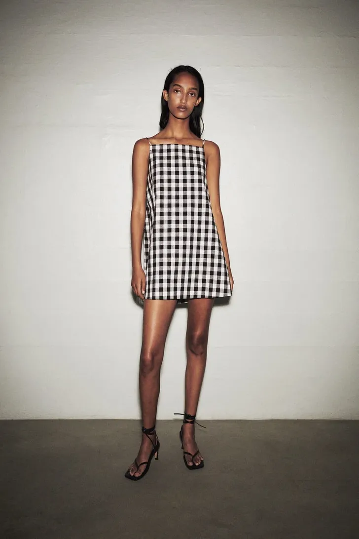Korte jurk van linnenmix met rechte halslijn en verstelbare spaghettibandjes met strik op de rug (Zara € 30)