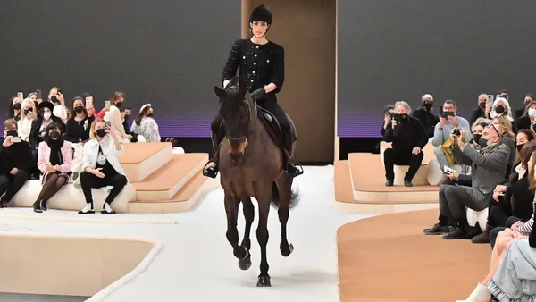 Charlotte, een van de gezichten van Chanel en de oudste dochter van Chanelfan prinses Caroline van Hannover (geboren van Monaco), opende zo de haute couture collectie voor S/S 2022 (het filmpje, waarin Xavier Veilhan constructivistische beelden en motieven over elkaar heen legt, begint op 02:50). Het paard was fashionably voorbeeldig en liet geen onwelvoeglijkheden achter voor de modellen.