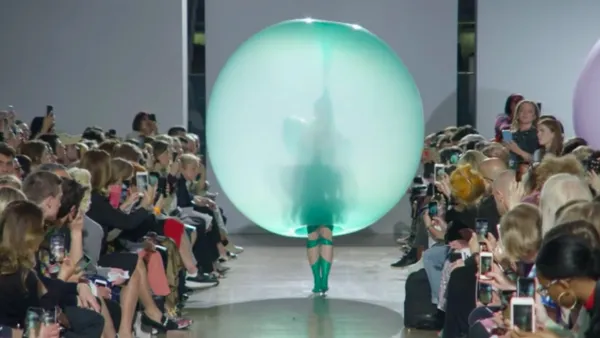 En we moeten zeggen, het is ingenieus. De jurken zijn gemaakt van rubber. Over de catwalk wandelden enorm grote en kleurrijke ballonnen. Bijzondere ballonnen dus, want deze moesten bewust leeglopen. Als dat gebeurt, verandert de creatie in een jurk.