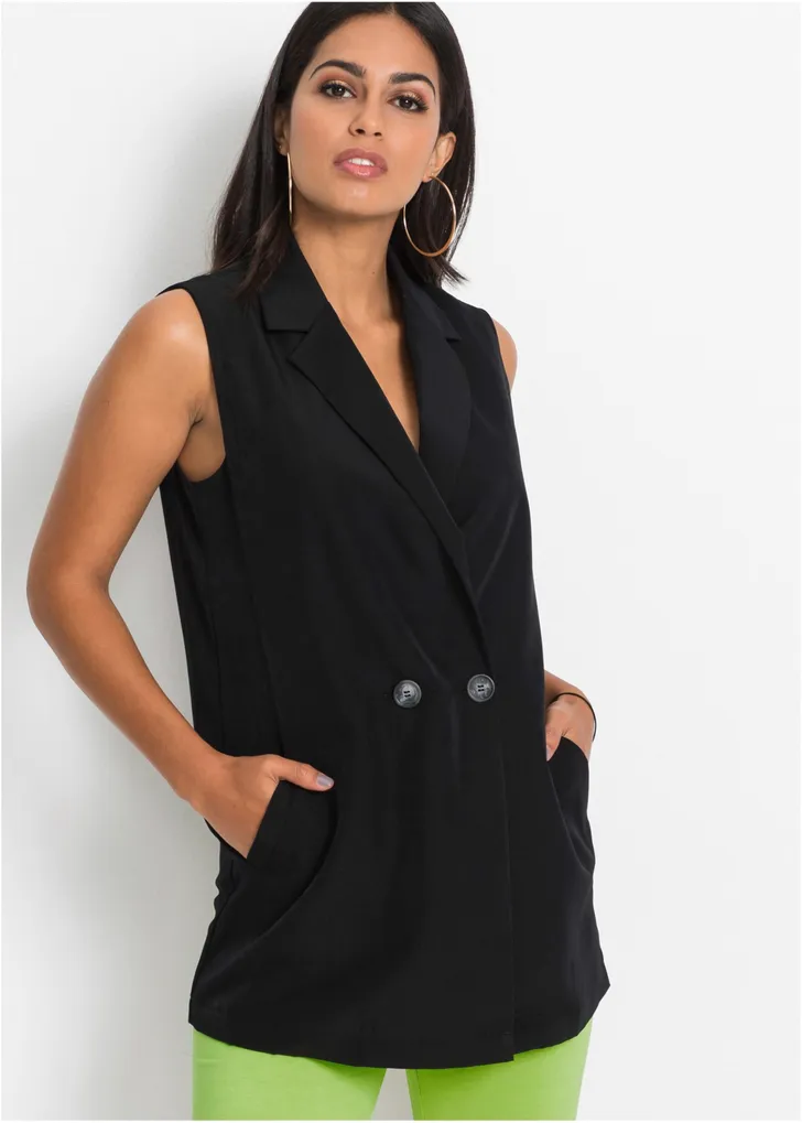 Lang bodyflirt gilet met een V-hals, ook verkrijgbaar in wit (Bonprix € 43)