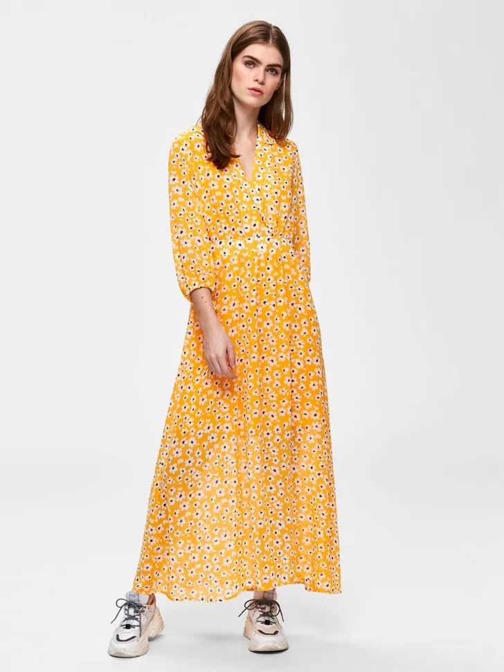 Deze maxi-jurk van Selected Femme (€ 99,99) is erg zomers. In combinatie met een fijne panty en een spijkerjasje geschikt voor zaterdag.