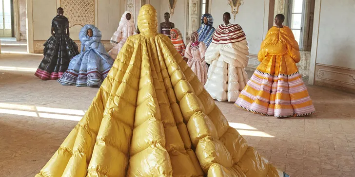 Moncler was al voor covid-19 uitbrak druk met het maken van avondkleding van puffermateriaal. Met name de avondjurken namen een vlucht: vergevingsgezind voor de coronakilo's, cool en edgy voor de zoom en meteen daarna lekker warm dutten op de bank in je eigen slaapzakjurk.