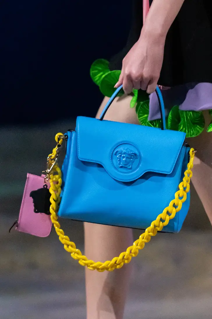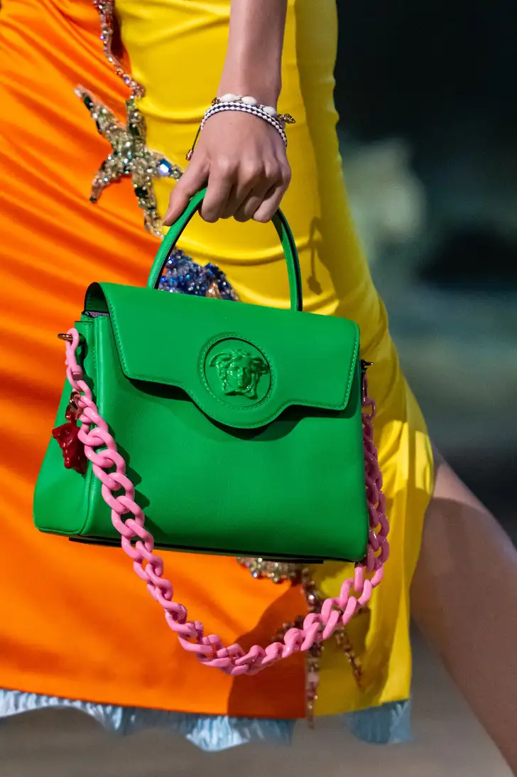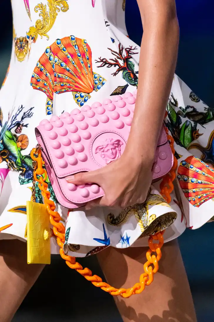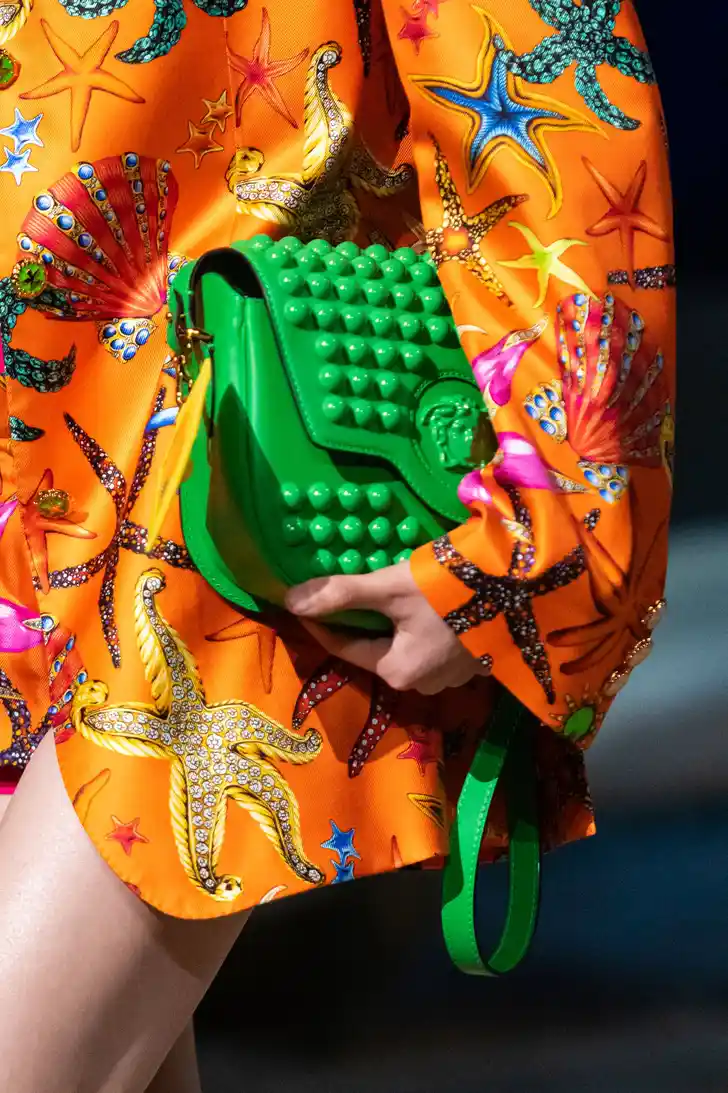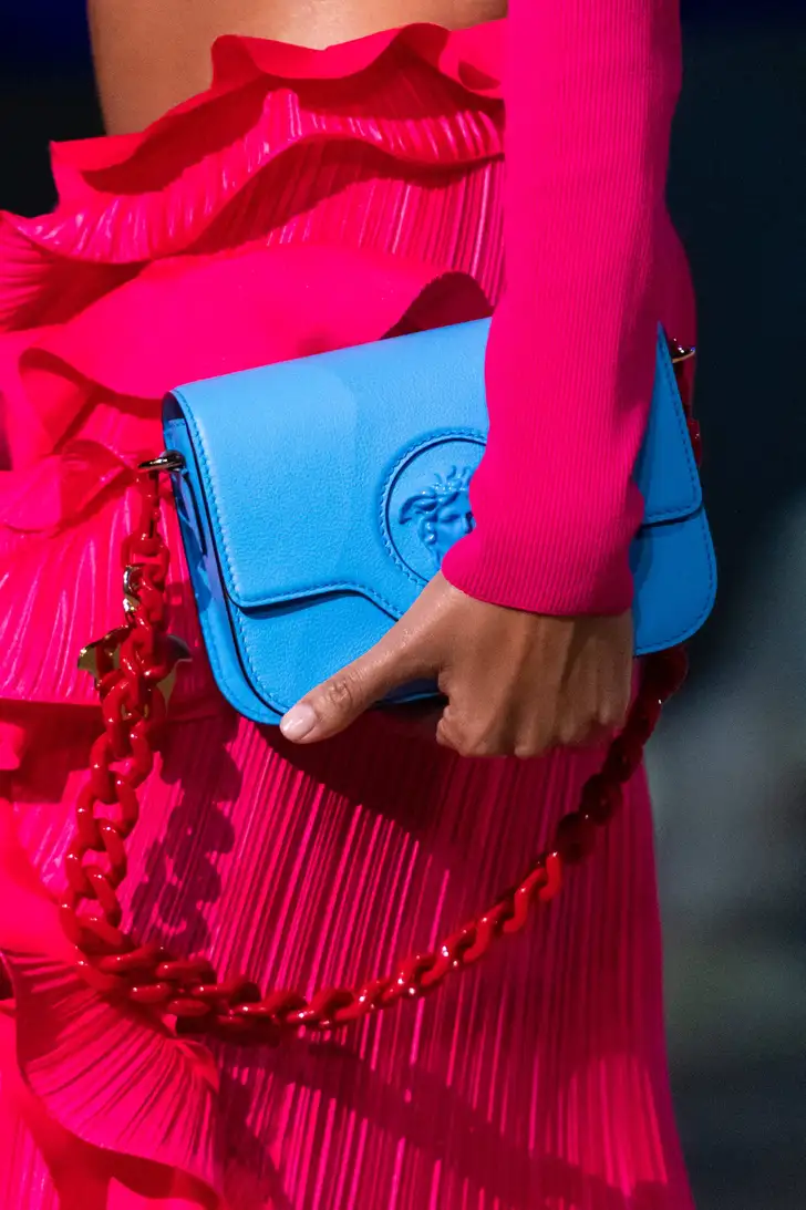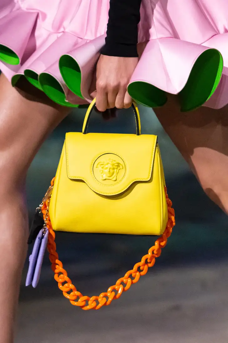 "Deze collectie heeft een optimistische ziel," zegt Donatella. "Dit zijn kleren voor dromers en voor positieve denkers." En voor liefhebbers van vrolijke handtassen.