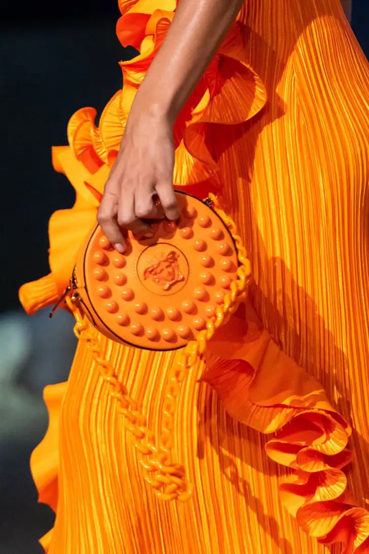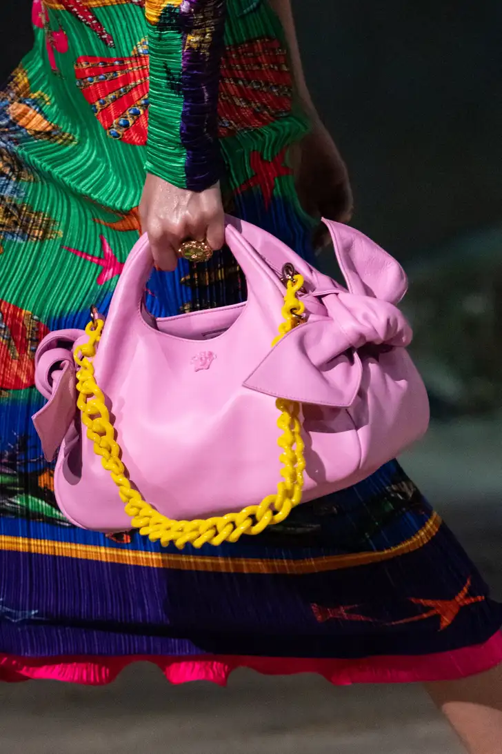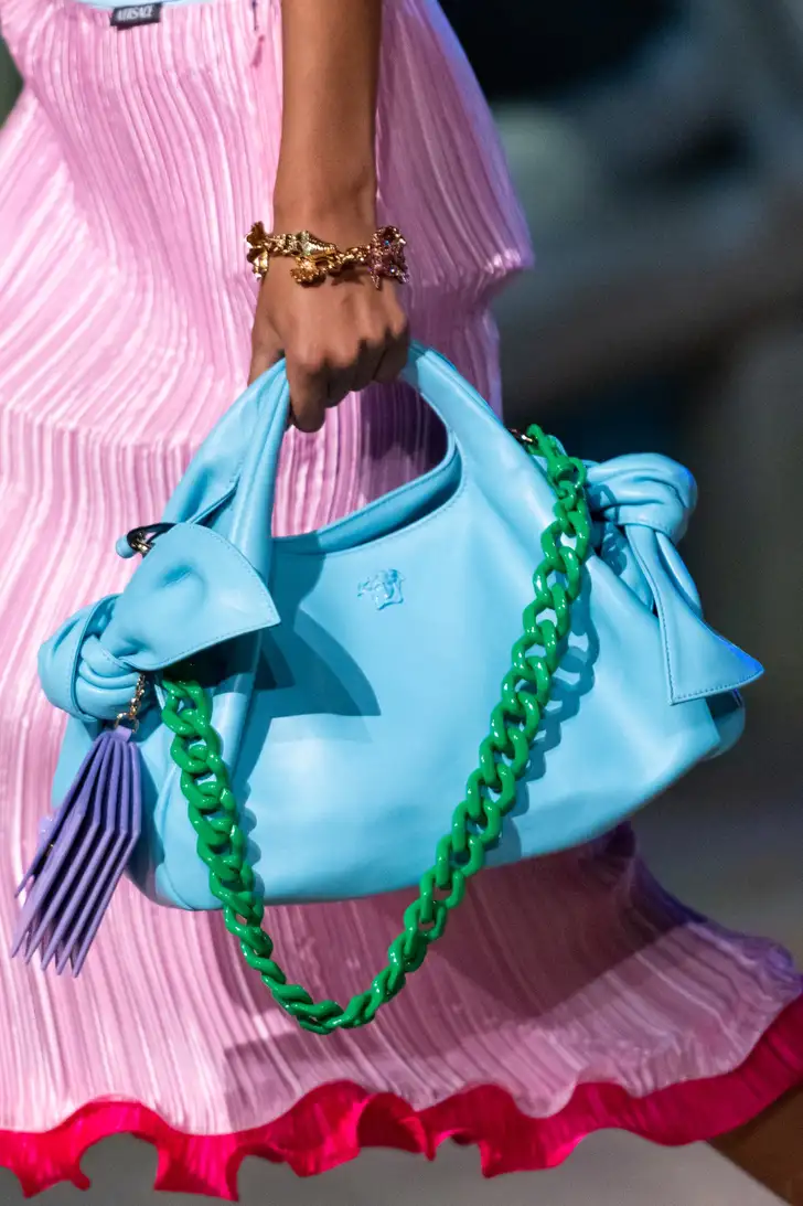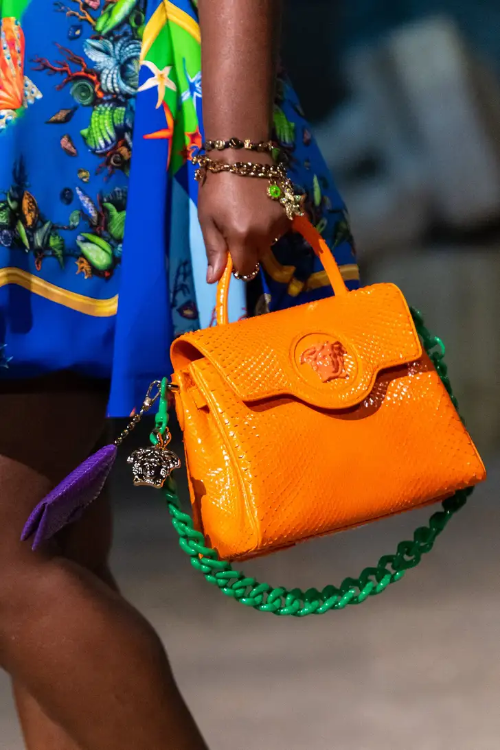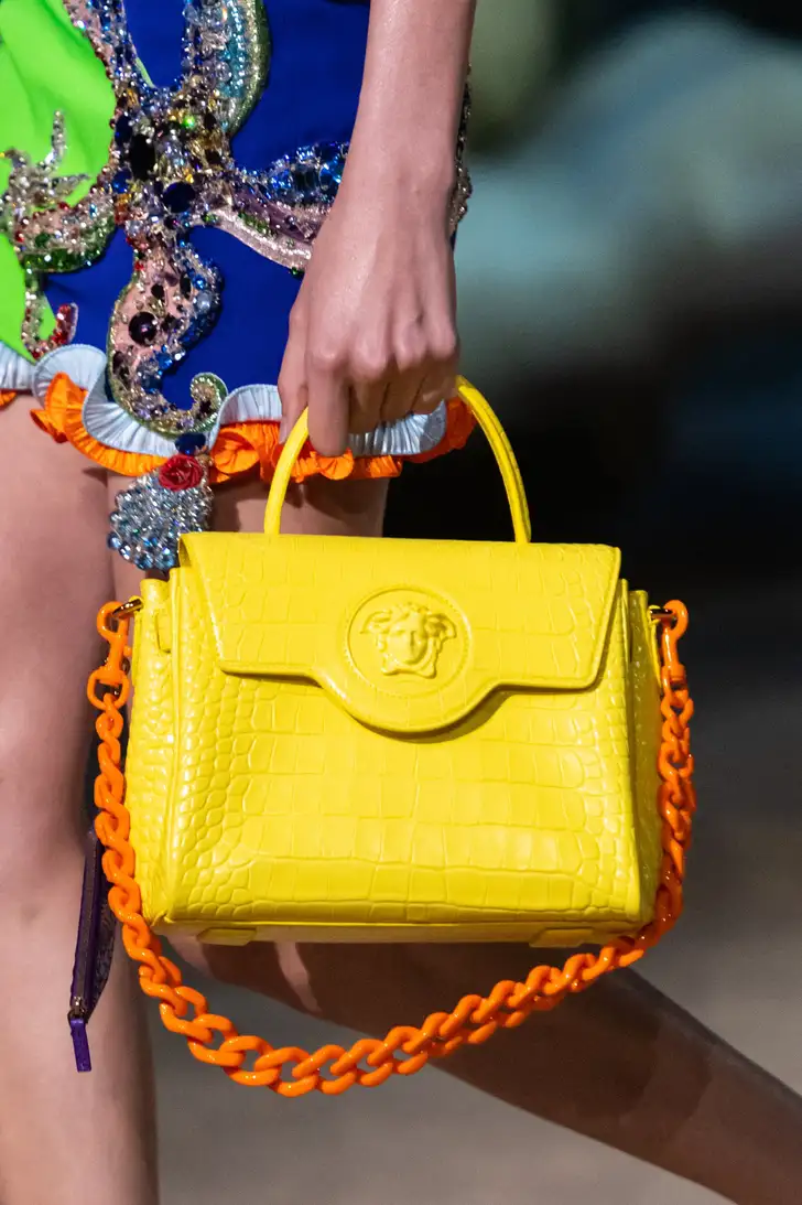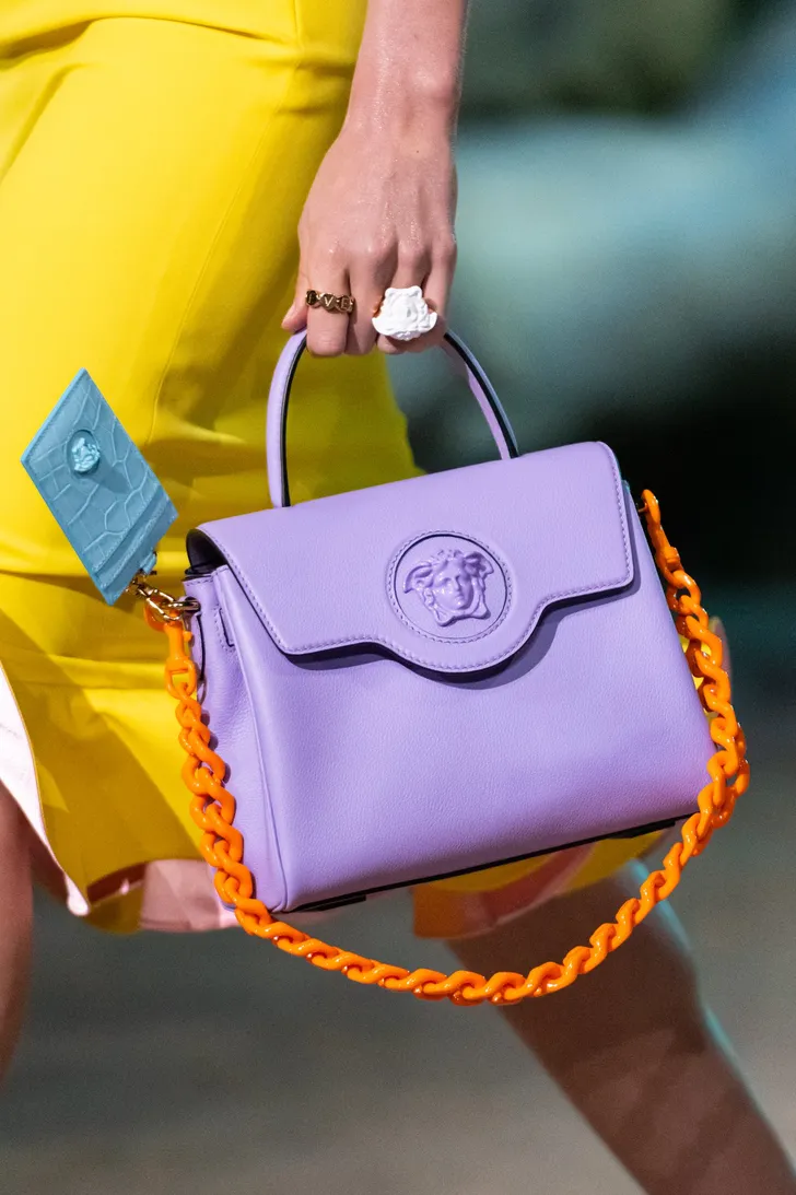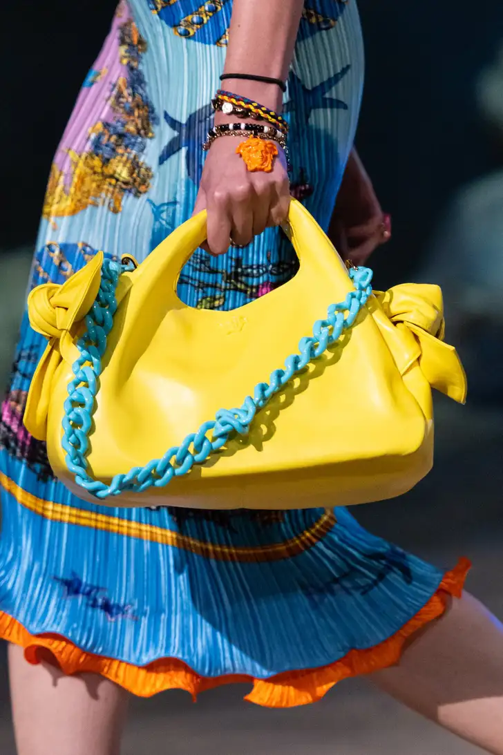 "Deze collectie heeft een optimistische ziel," zegt Donatella. "Dit zijn kleren voor dromers en voor positieve denkers." En voor liefhebbers van vrolijke handtassen.