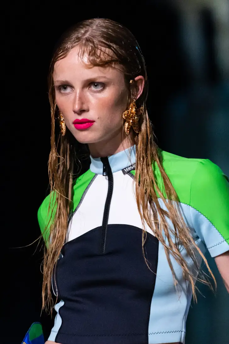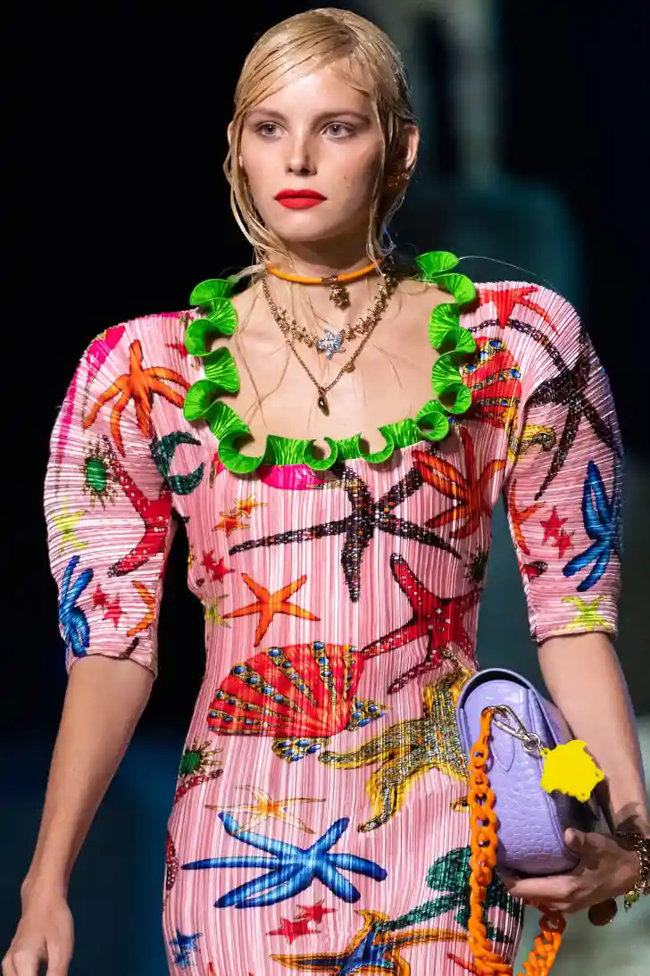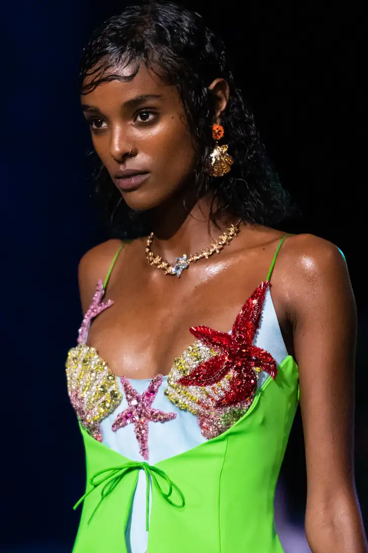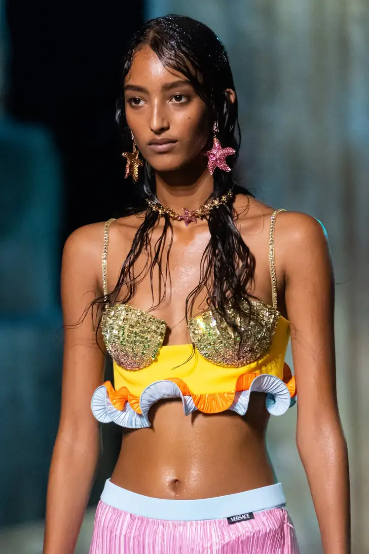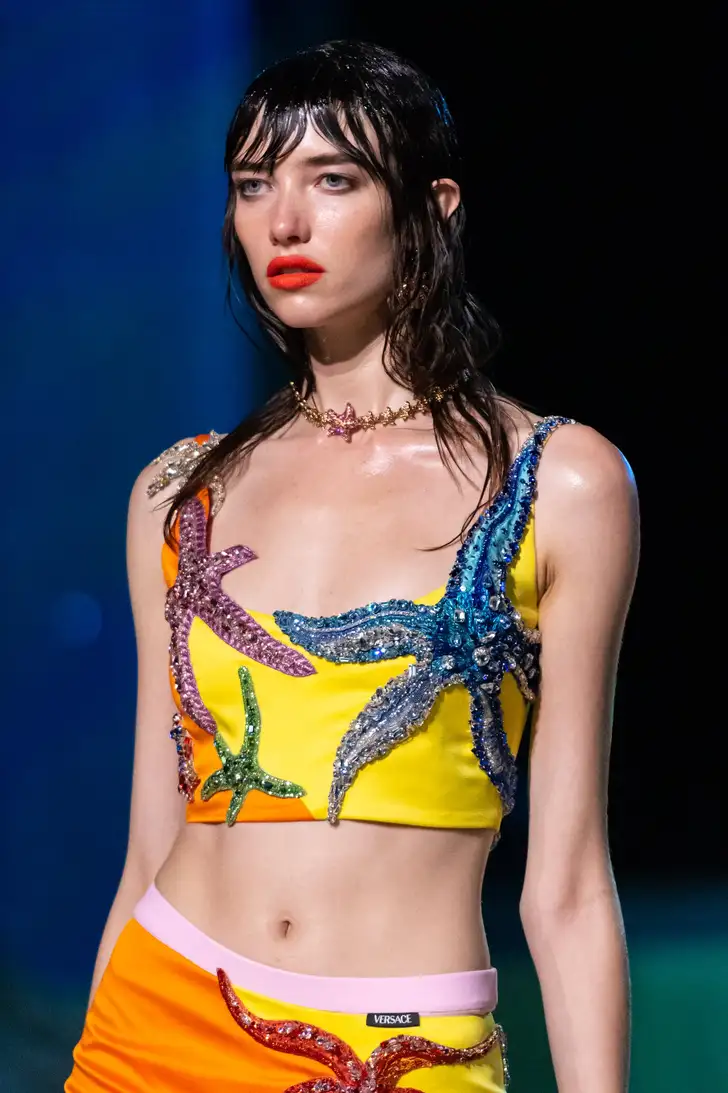 Het leidde tot een collectie met veel zeesterren en andere verwijzingen naar de oceaan, alsof Medusa een duik nam tussen het koraal, de vissen en surrealistische waterwezens. De modellen hadden dan ook een wetlook als kapsel en Donatella had voor het eerst ook een paar modellen met een wat grotere maat gecast.