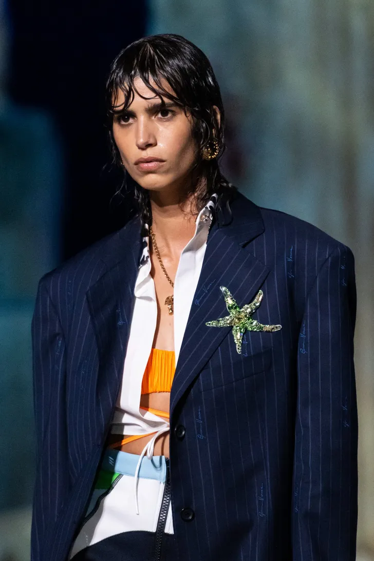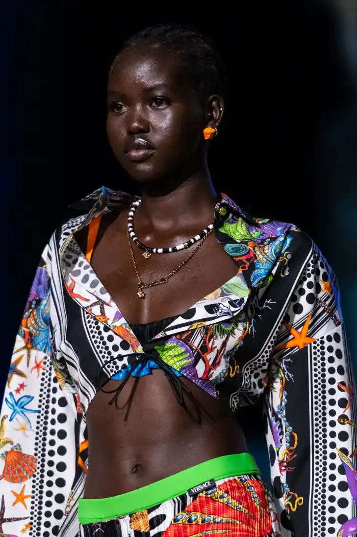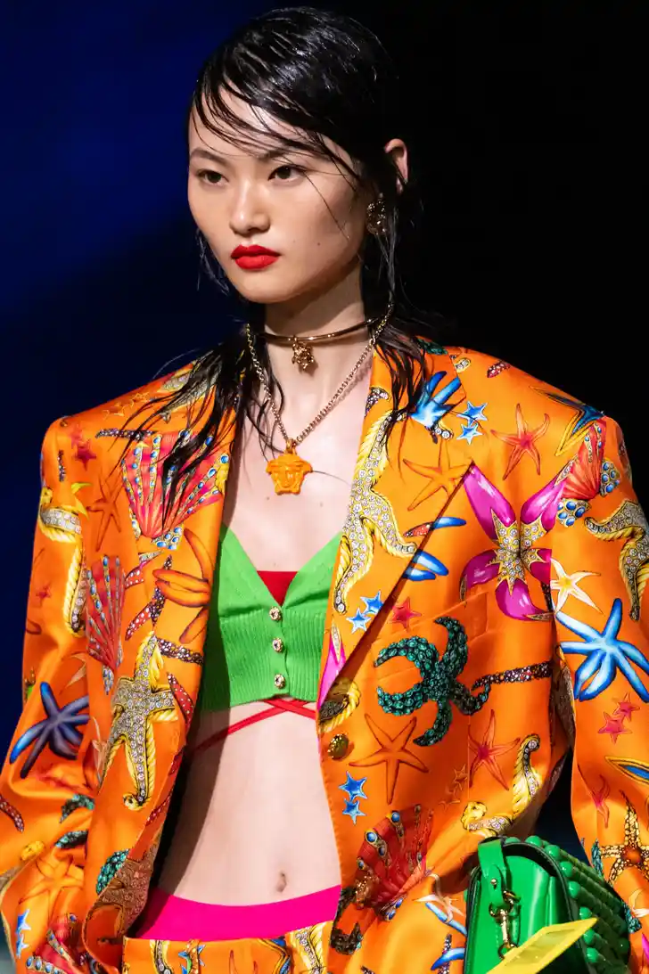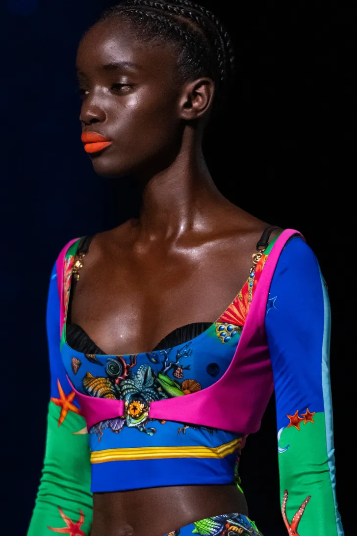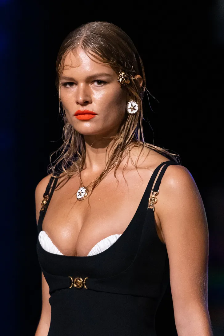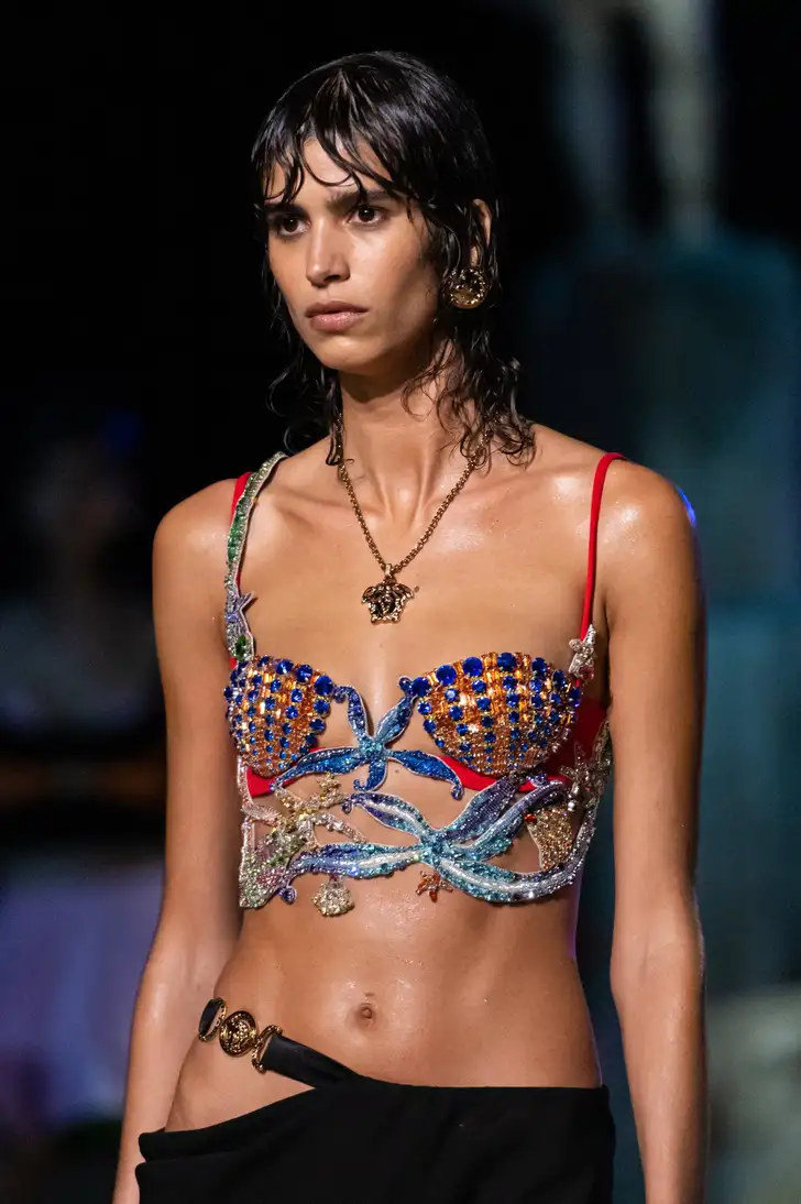 Het leidde tot een collectie met veel zeesterren en andere verwijzingen naar de oceaan, alsof Medusa een duik nam tussen het koraal, de vissen en surrealistische waterwezens. De modellen hadden dan ook een wetlook als kapsel en Donatella had voor het eerst ook een paar modellen met een wat grotere maat gecast.