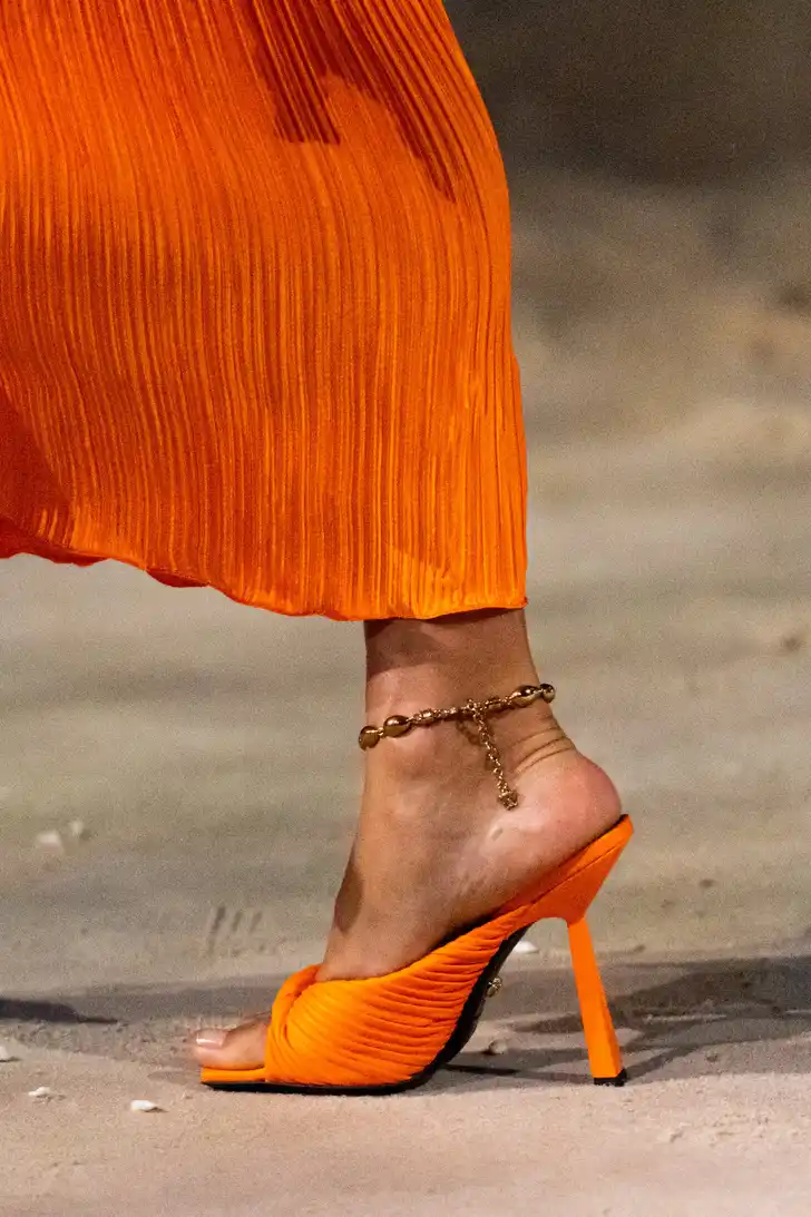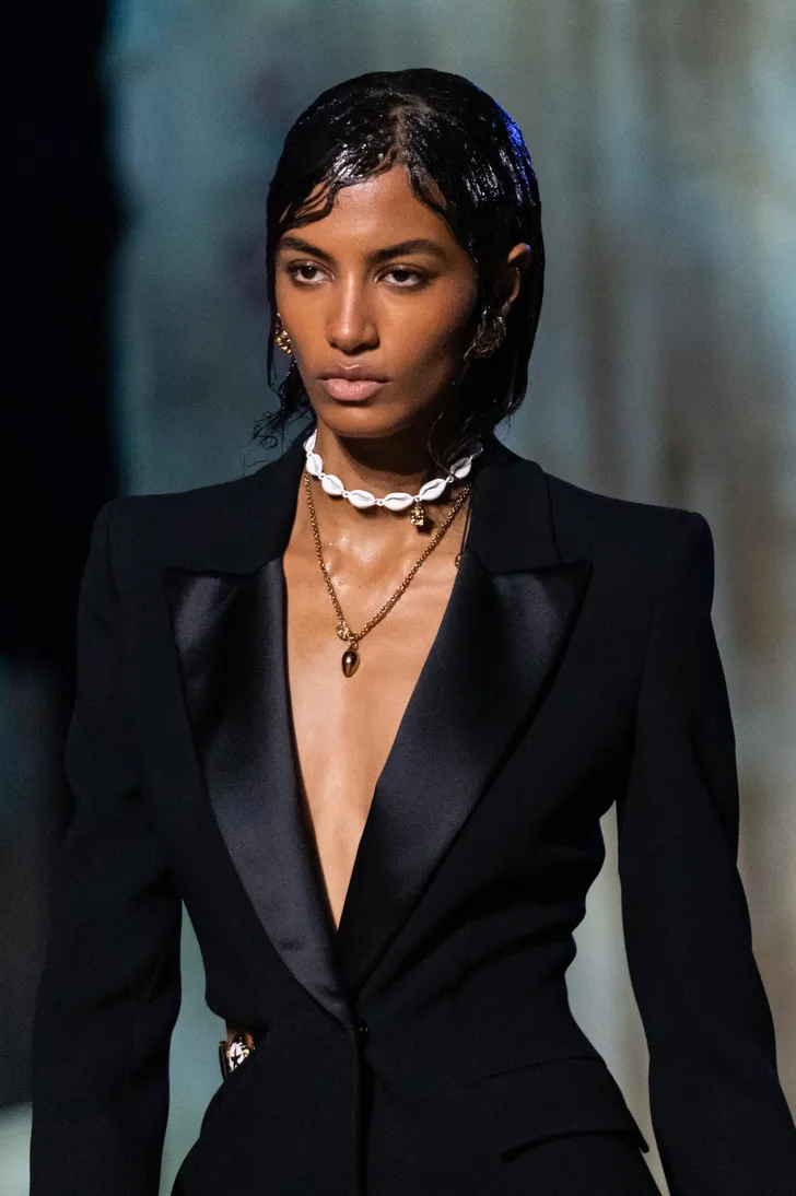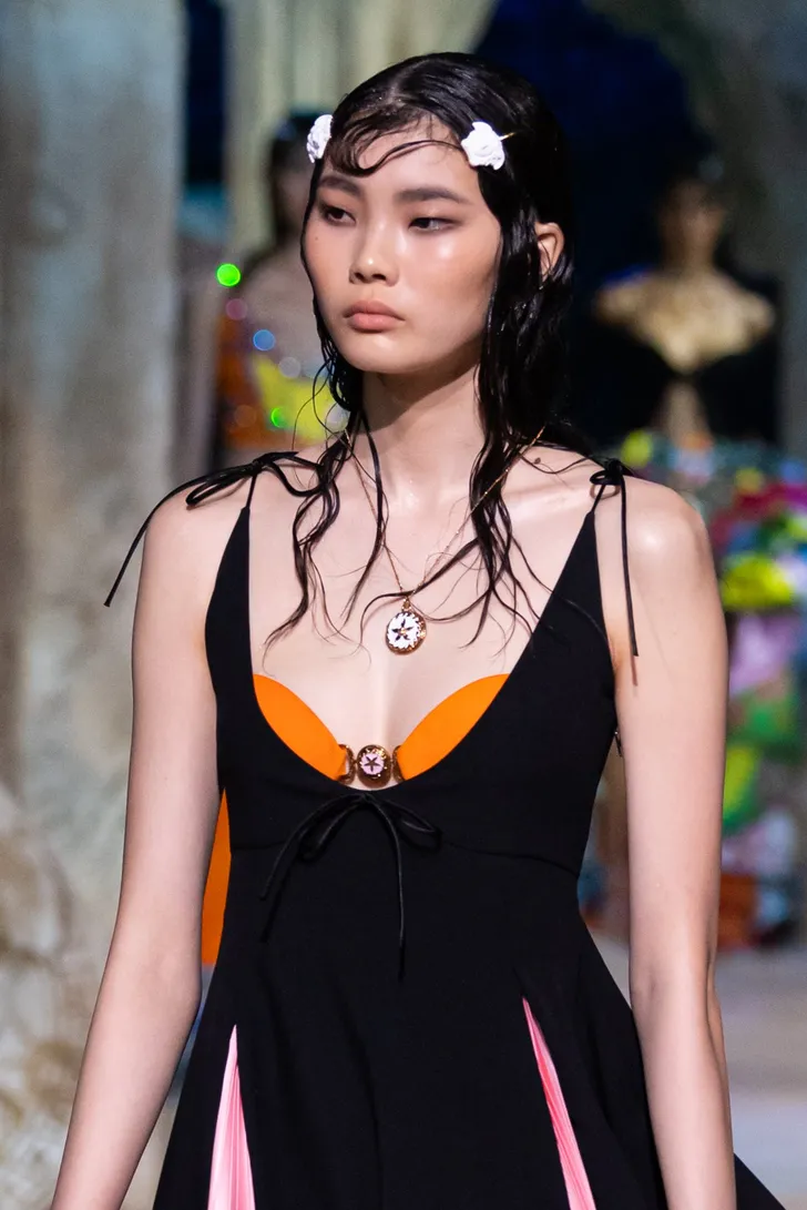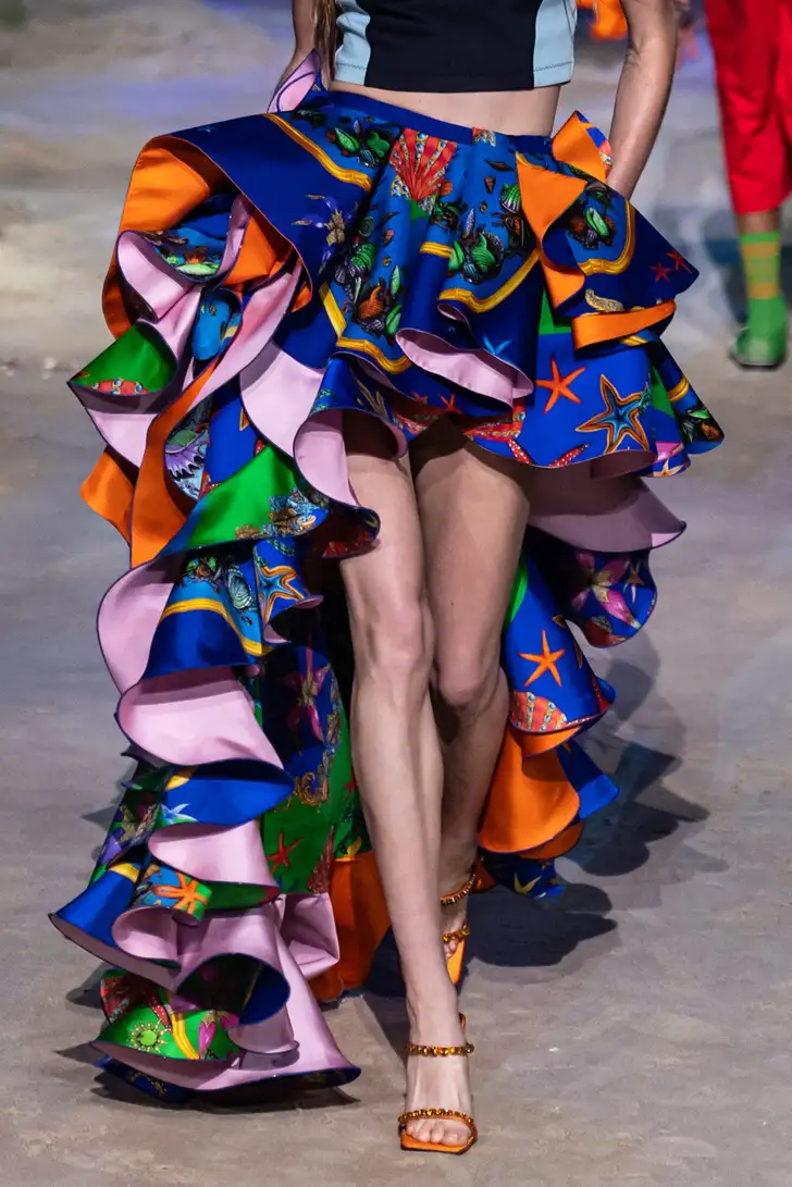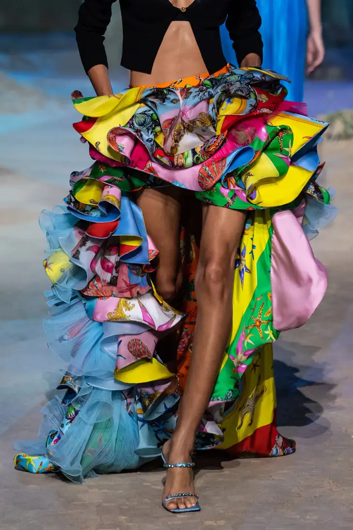 Het leidde tot een collectie met veel zeesterren en andere verwijzingen naar de oceaan, alsof Medusa een duik nam tussen het koraal, de vissen en surrealistische waterwezens. De modellen hadden dan ook een wetlook als kapsel en Donatella had voor het eerst ook een paar modellen met een wat grotere maat gecast.