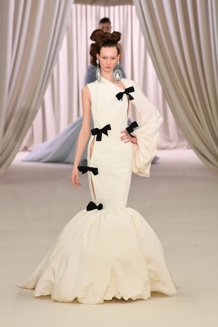 Dat gezegd hebbende: de grote blikvanger van de collectie was een vrij eenvoudig en sluik ontwerp, in crème met zwarte strikjes. Hoe verrukkelijk alle tule ook is, soms is minder echt meer.