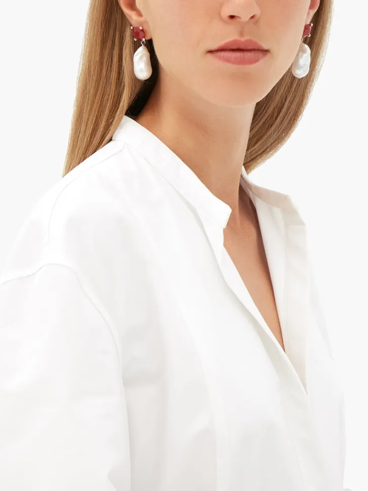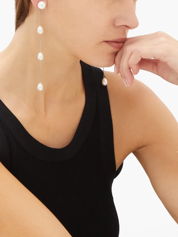 Lange oorhangers van zilver en kunstparels, handgemaakt door Sophie Buhai (Matches Fashion € 370)