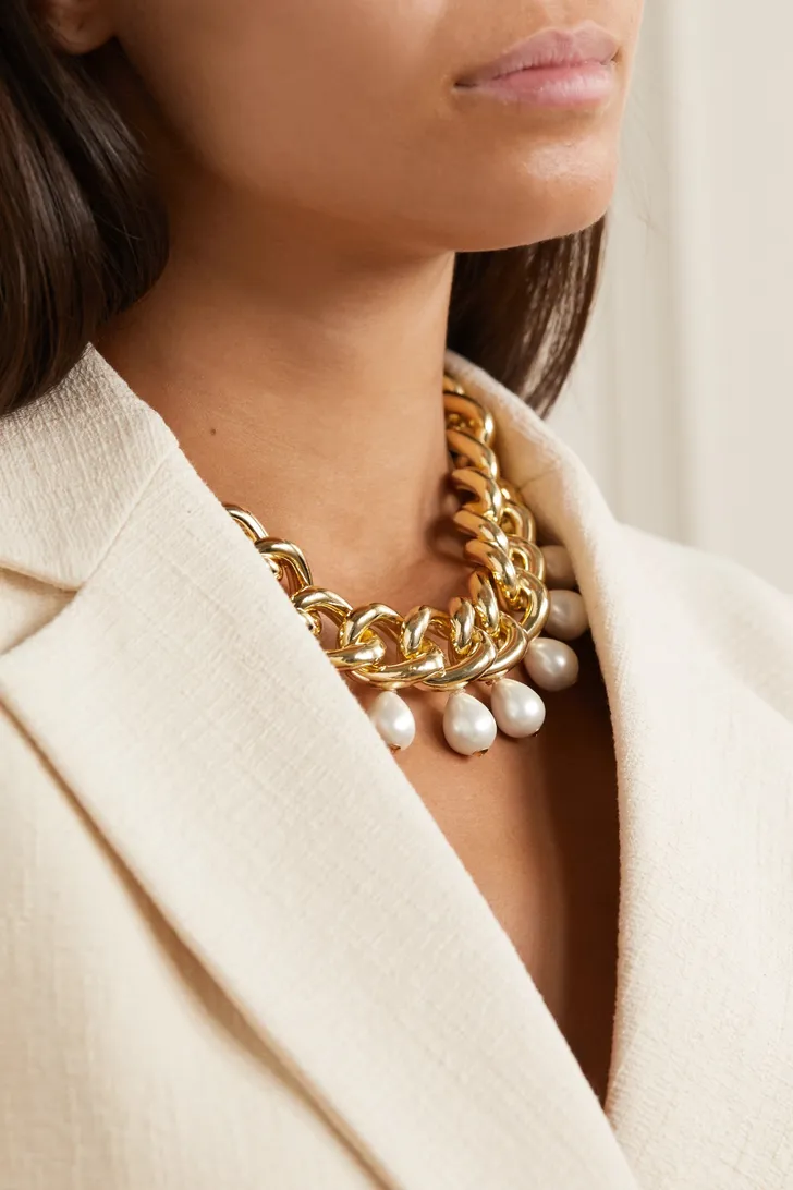 Chloé brengt twee trends in één: gekleurd kristal en een barokke parel (Matches Fashion € 370)