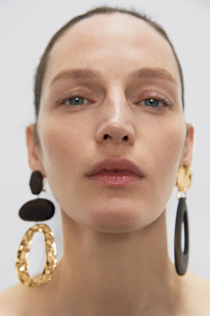 Asymmetrische oorhangers, goudgeel met hout (Zara € 13)