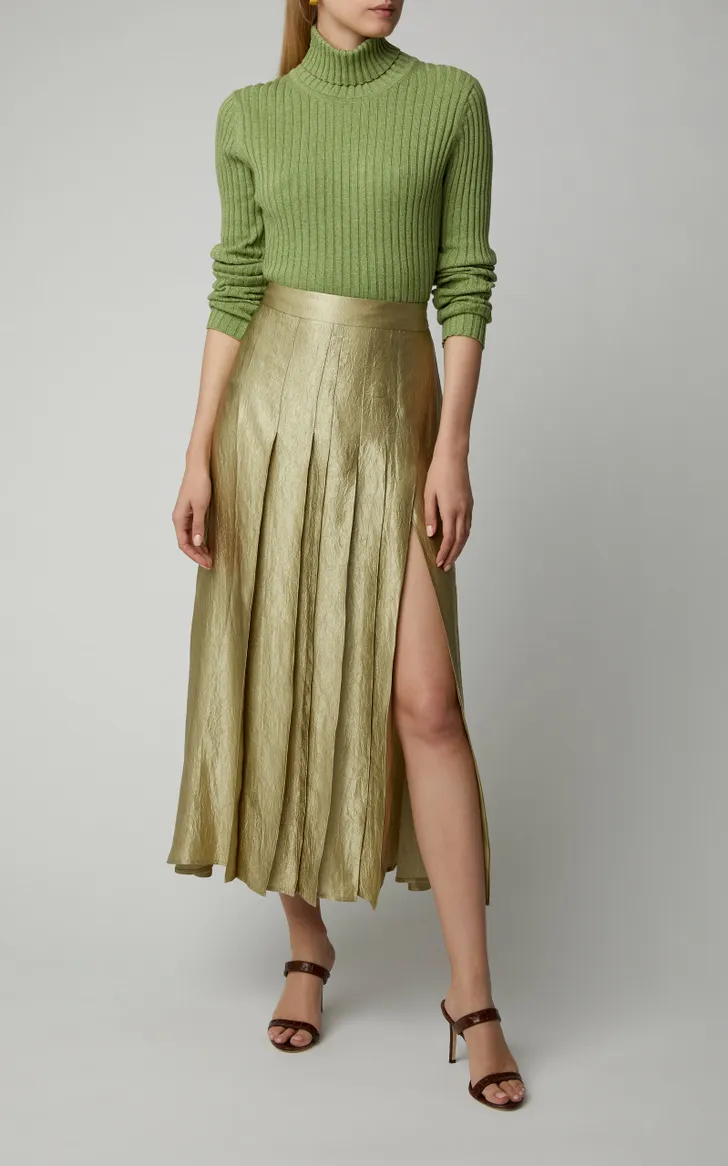 Midi-rok van Anna Quan van tafzijde met diepe plooien (Moda Operandi € 138)
