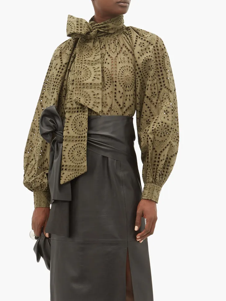 Kaki broderie van Ganni met een forse strik (Matches Fashion € 179)